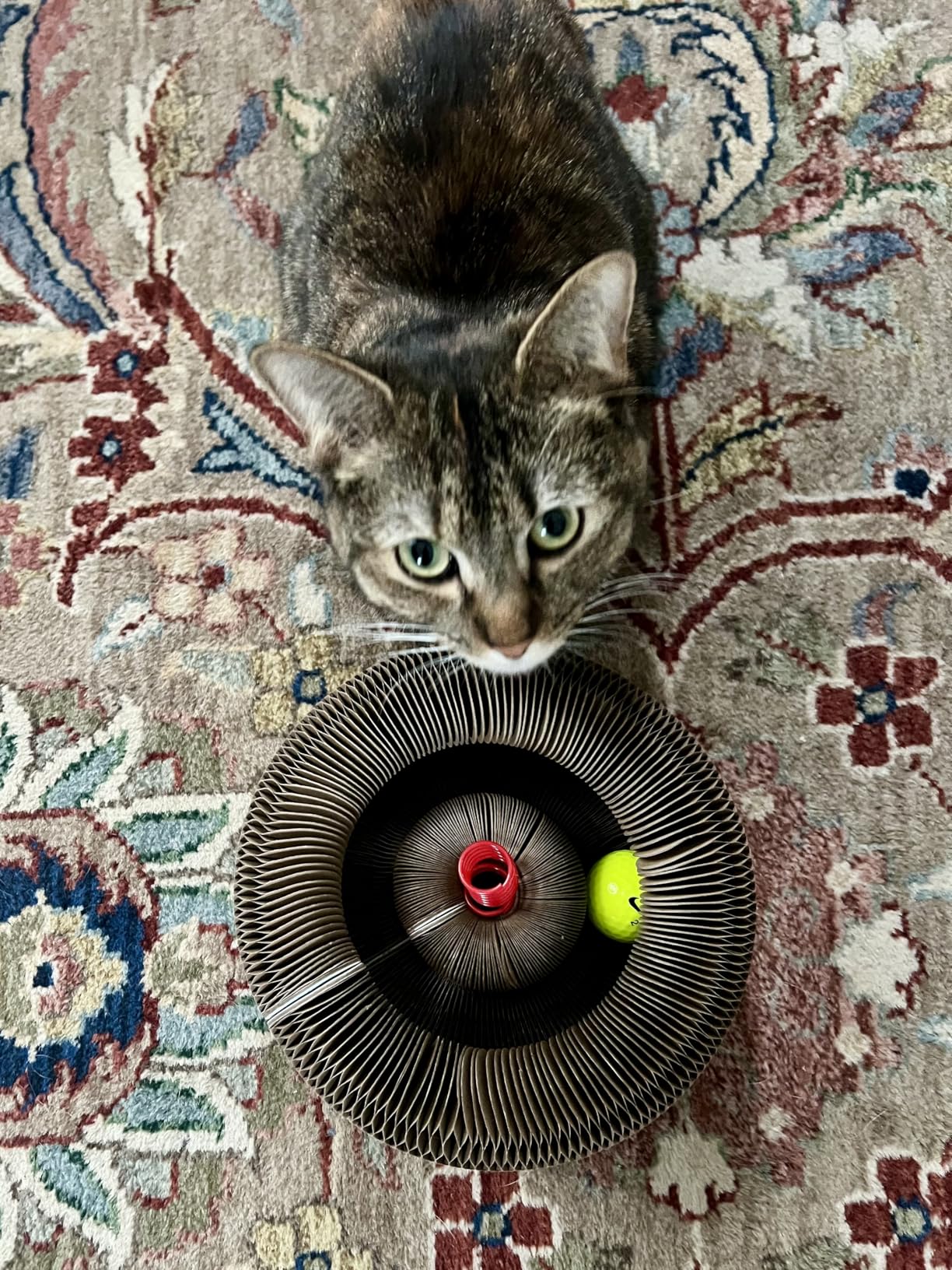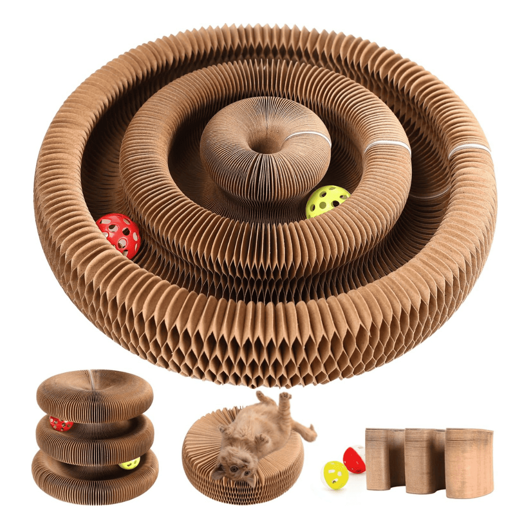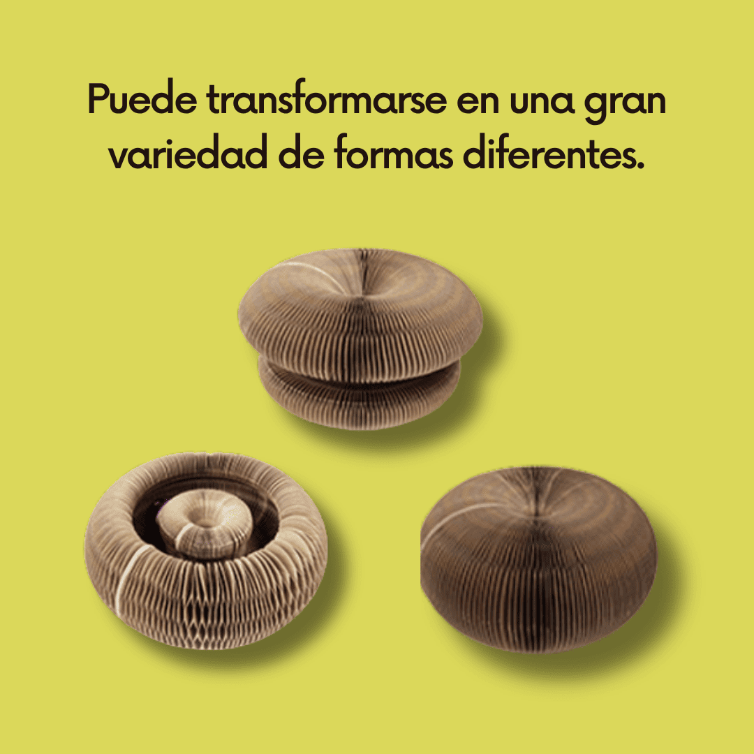 FlexiPaw™ es un juguete interactivo y rascador 3 en 1 para gatos que se transforma en forma de bola, hongo o plato giratorio. Cerrado mide 11 x 11 x 7 cm y abierto alcanza 24 x 24 x 10 cm, con un peso de aproximadamente 320 gramos. Está fabricado con cartón corrugado ecológico tipo panal, resistente, seguro y libre de químicos. El paquete incluye una bola con campana y un sobre pequeño de hierba gatera natural para estimular aún más a tu gato.